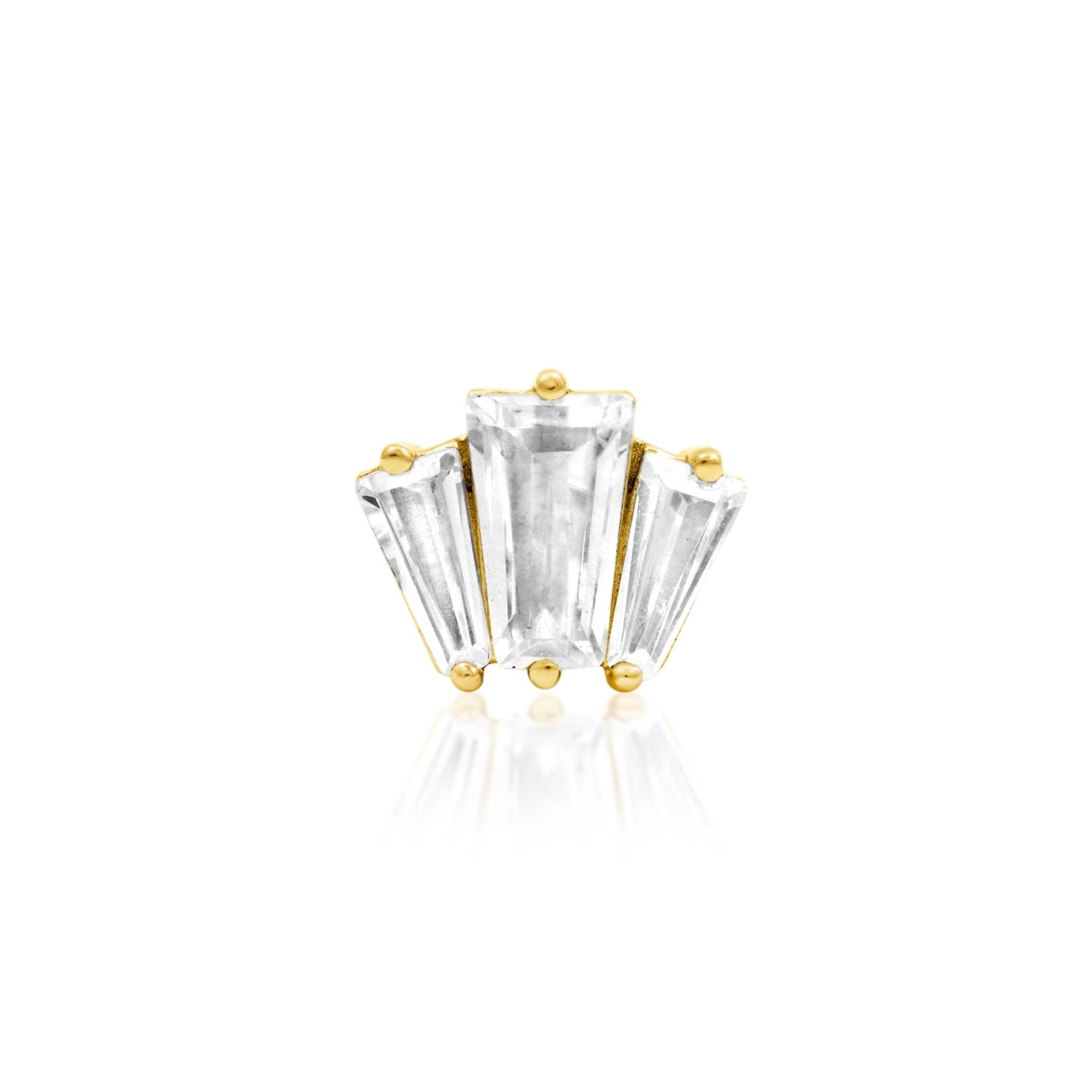 A chorus of 3 super sparkling baguette cut CZs ( 5x3x2mm, 4x2x1mm x2), mounted on a 14k beaded prong side setting.